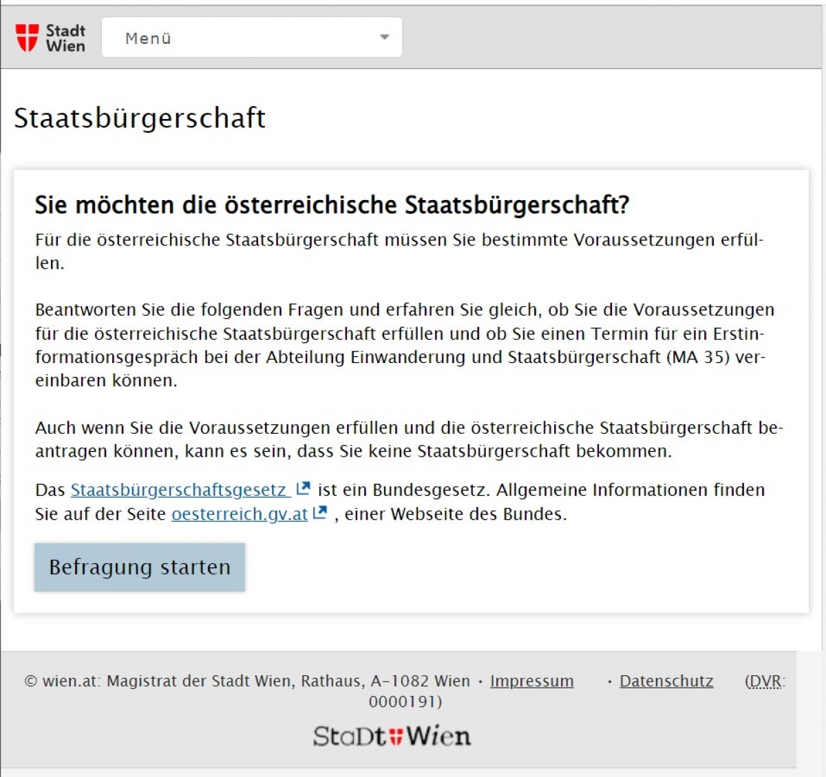Para obtener la nacionalidad austriaca hay que cumplir determinados requisitos. Existe una herramienta con la que puedes averiguar de inmediato si cumples los requisitos para obtener la nacionalidad austriaca y si puedes concertar una cita para una primera entrevista informativa en el Departamento de Inmigración y Ciudadanía (MA 35).